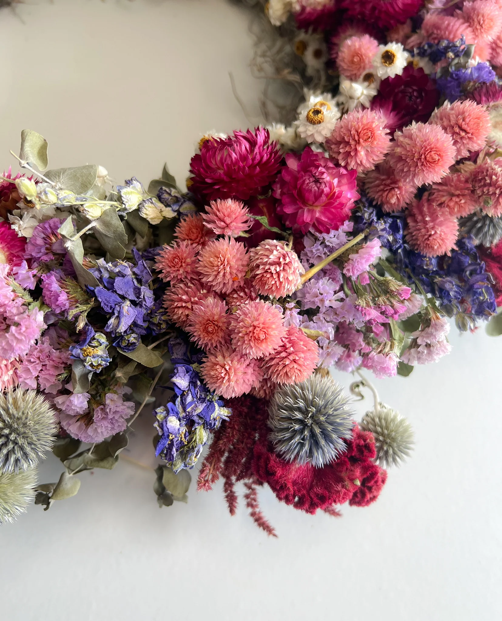 These wreaths are all made to order. You can expect to receive your dried flower wreath in 2-3 weeks. Each wreath is handmade so there will be some variation in your wreath based on what is available in our dried loft.Â