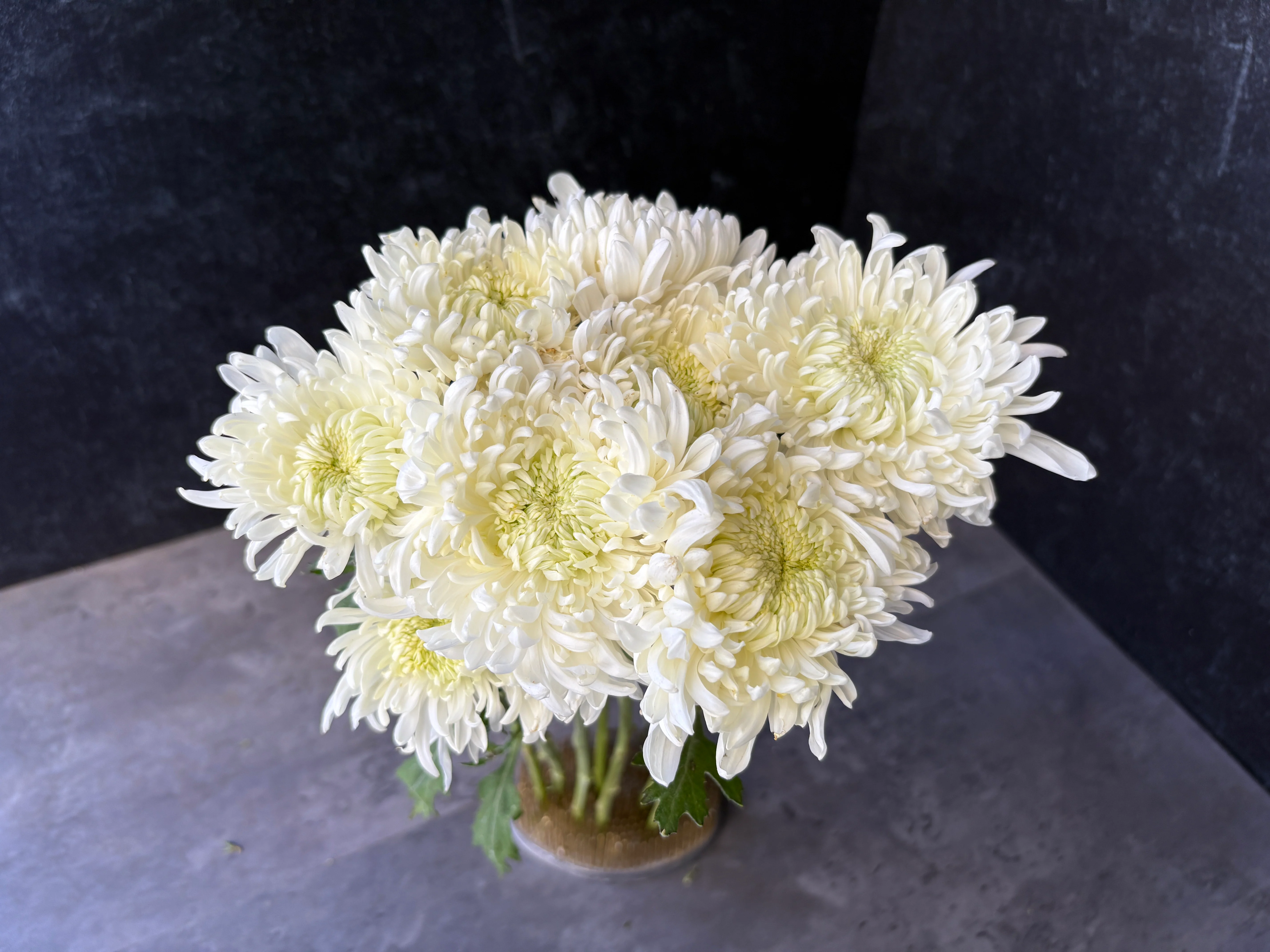 This is a white bloom with some cream throughout the petals. The center of the bloom is a lime green color